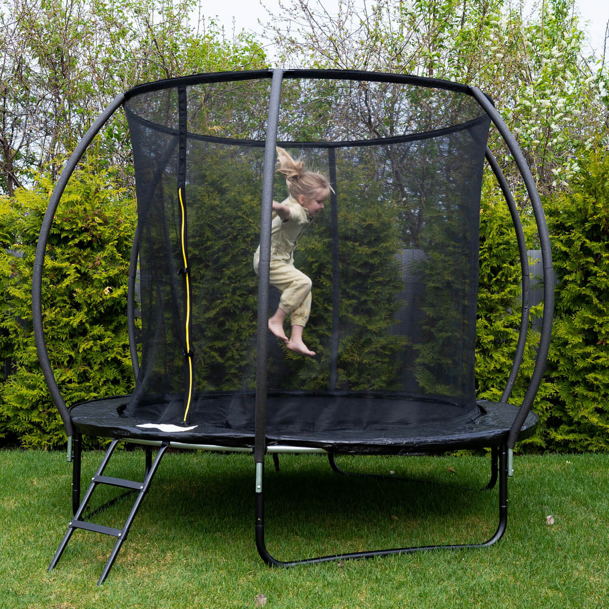 Прочная высокая сетка, тщательно натянутое упругое полотно, закрытые пружины гарантируют максимальную безопасность во время джампинга, качественные материалы обеспечивают долговечность, износостойкость и надежность конструкции.